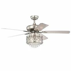 Create beautiful light while conditioning the air in the room with this Vidor aged silver five-blade ceiling fan and crystal drum shade. With a spread of 52 inches, this reversible fan can move a lot of air, and includes a remote control to make it easy to change the settings from your chair. The blades also reverse to white maple, allowing you to change up your room’s decor as desired. Within the drum shade is a cascade of crystals designed like a formal chandelier, creating an elegant look.
